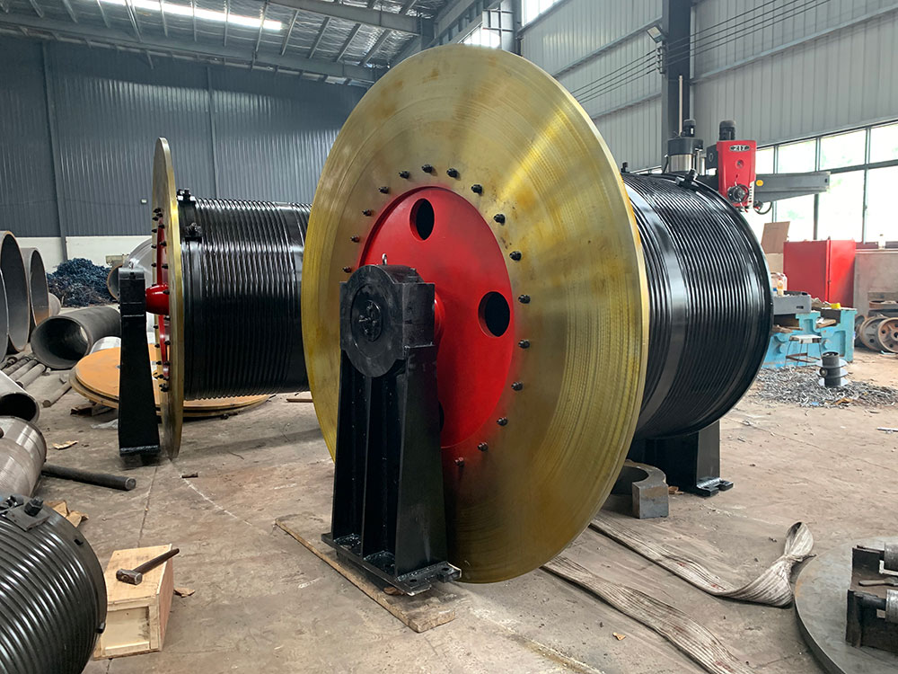 如果起升高度較大的時(shí)候,為了縮小卷筒的尺寸,可采用表面帶導(dǎo)向螺旋槽或光滑的卷筒進(jìn)行多層卷繞,但鋼絲繩磨損較快,適用于慢速和工作類(lèi)型較輕,噸位較低的起重機(jī)。鋼板卷筒組則主要適用于大噸位、性能要求高的起重機(jī)械設(shè)備。